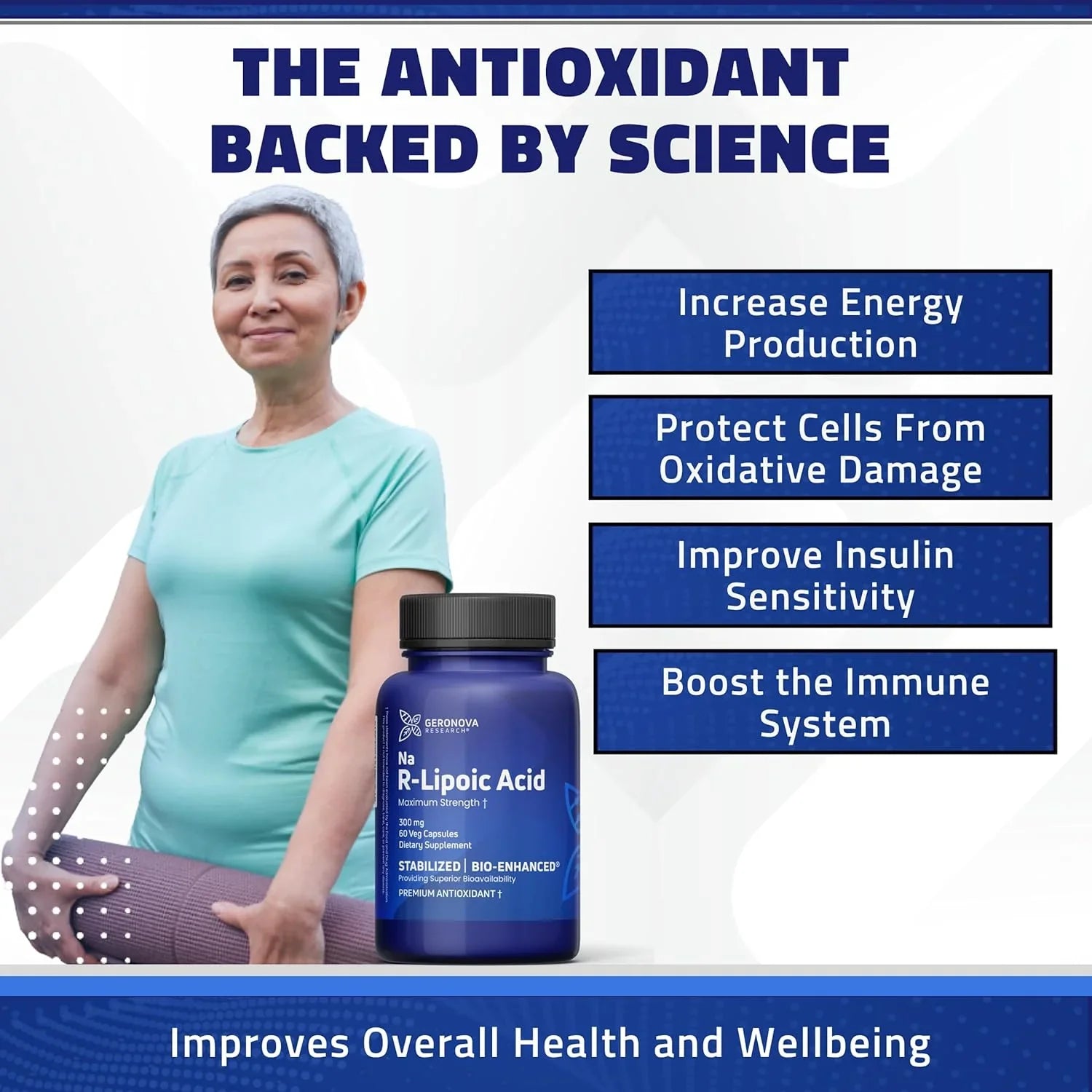 Geronova Research's formula uses a bio-enhanced version of R-Lipoic Acid, meaning it has been designed to increase its absorption and efficiency in the body. This has been done through a proprietary technology that reduces the R-Lipoic Acid particle size, improving its bioavailability.