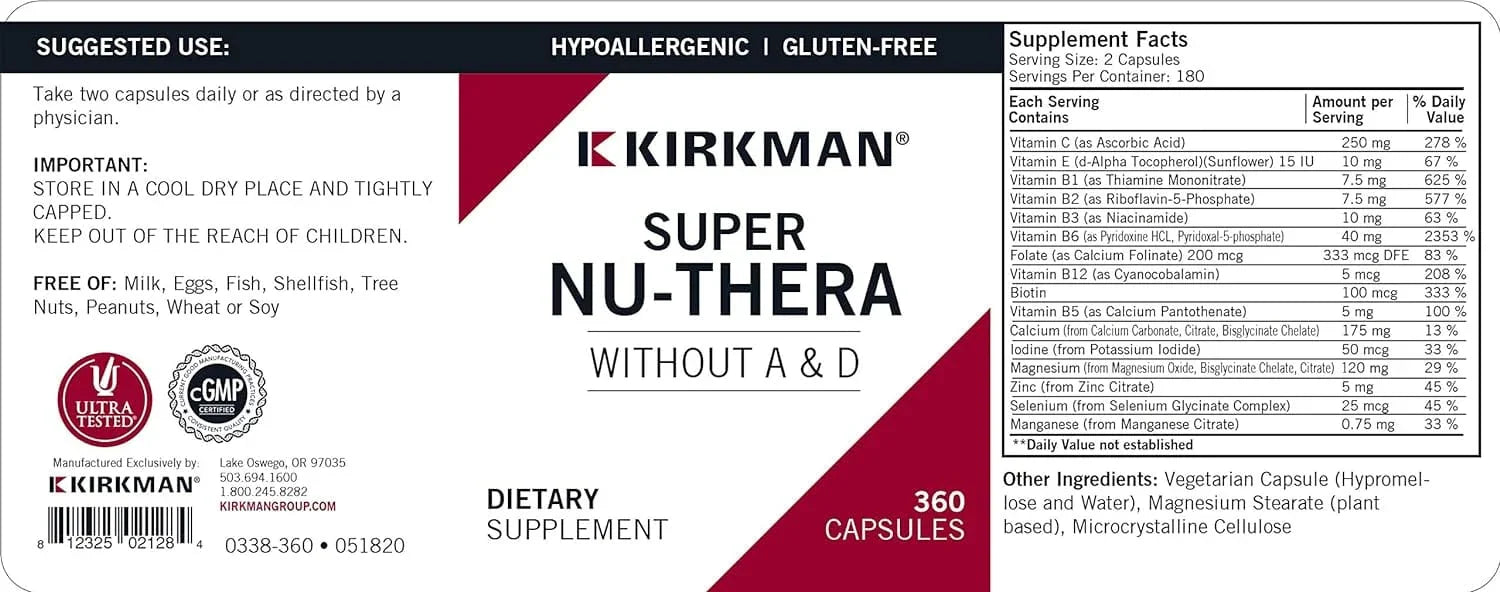 Super Nu-Thera without Vitamins A and D, by Kirkman Laboratories, is a dietary supplement designed to support overall health and well-being. The product comes in a bottle containing 360 capsules. This multi-vitamin/mineral supplement provides a comprehensive spectrum of essential nutrients, excluding vitamins A and D.