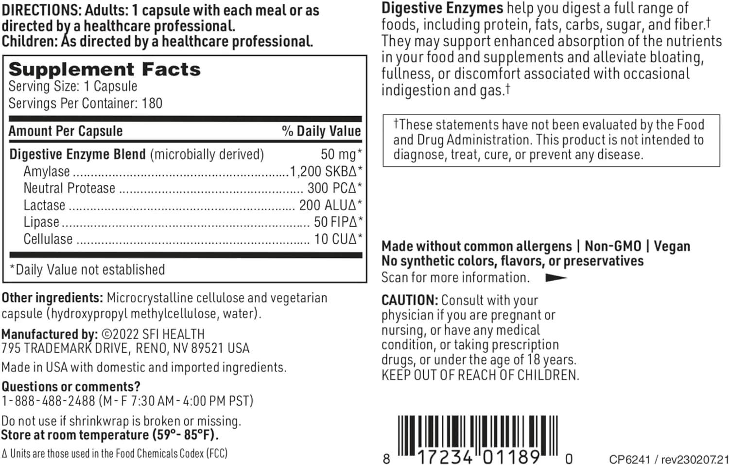 Every capsule offers a combination of enzymes including amylase, lipase, cellulase, protease, invertase, maltase, lactase, and others. Amylase breaks down carbohydrates, lipase breaks down fats, cellulase breaks down fiber, and protease breaks down proteins. Invertase and maltase help with digestion of sugars, while lactase aids in the digestion of lactose. This combination of enzymes supports digestion of a broad spectrum of foods.