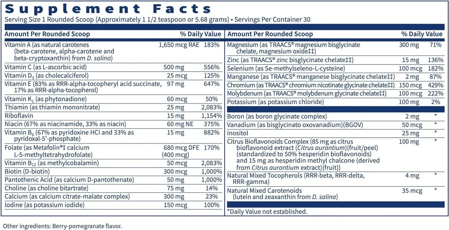 This formula features activated B vitamins, and trace minerals, including patented Albion® chelated minerals and TRAACs®, for optimal absorption. It also provides vitamin D3 and vitamin K2 to support bone health. The supplement doesn't contain any common allergens such as milk, casein, eggs, gluten, or nuts. It is also free from artificial colors, flavors, and preservatives.