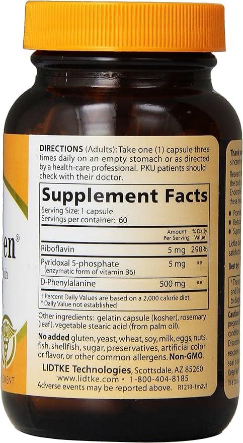 Endorphigen - 60 Caps - Lidtke is a dietary supplement containing 500mg of DL-Phenylalanine. Phenylalanine is an essential amino acid, which our body cannot produce naturally and must be obtained through diet. Lidtke's Endorphigen provides this in a safe and convenient form to support healthy mood and emotional well-being.