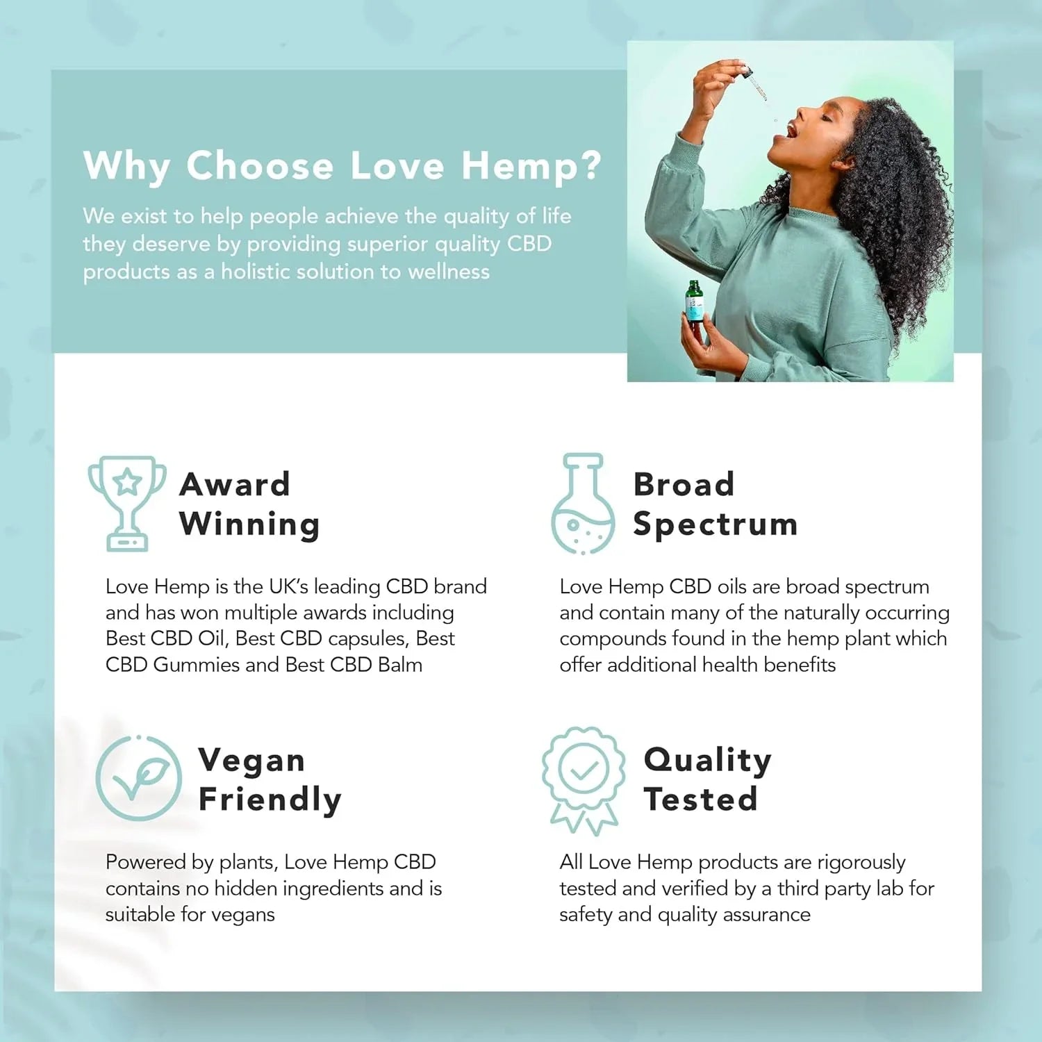 Love Hemp® CBD Oil Drops are designed for those seeking the benefits of CBD in a simple and versatile format. The product should be stored in a cool, dry place away from direct sunlight. Keep out of reach of children. This product is not intended to diagnose, treat, cure, or prevent any disease. Users should consult a healthcare professional before using if they have any medical conditions or are taking medications.