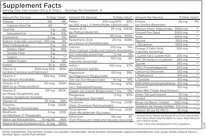 The main ingredients of Metabolic Detox Complete are diverse. They include a blend of pea, rice, and hemp, protein-rich compounds known for their hypoallergenic properties. Other components are amino acids, plant extracts, fibers, antioxidants, as well as a range of vitamins and minerals such as vitamin A, vitamin C, iron, and calcium. These are essential for aiding detoxification processes in the body.