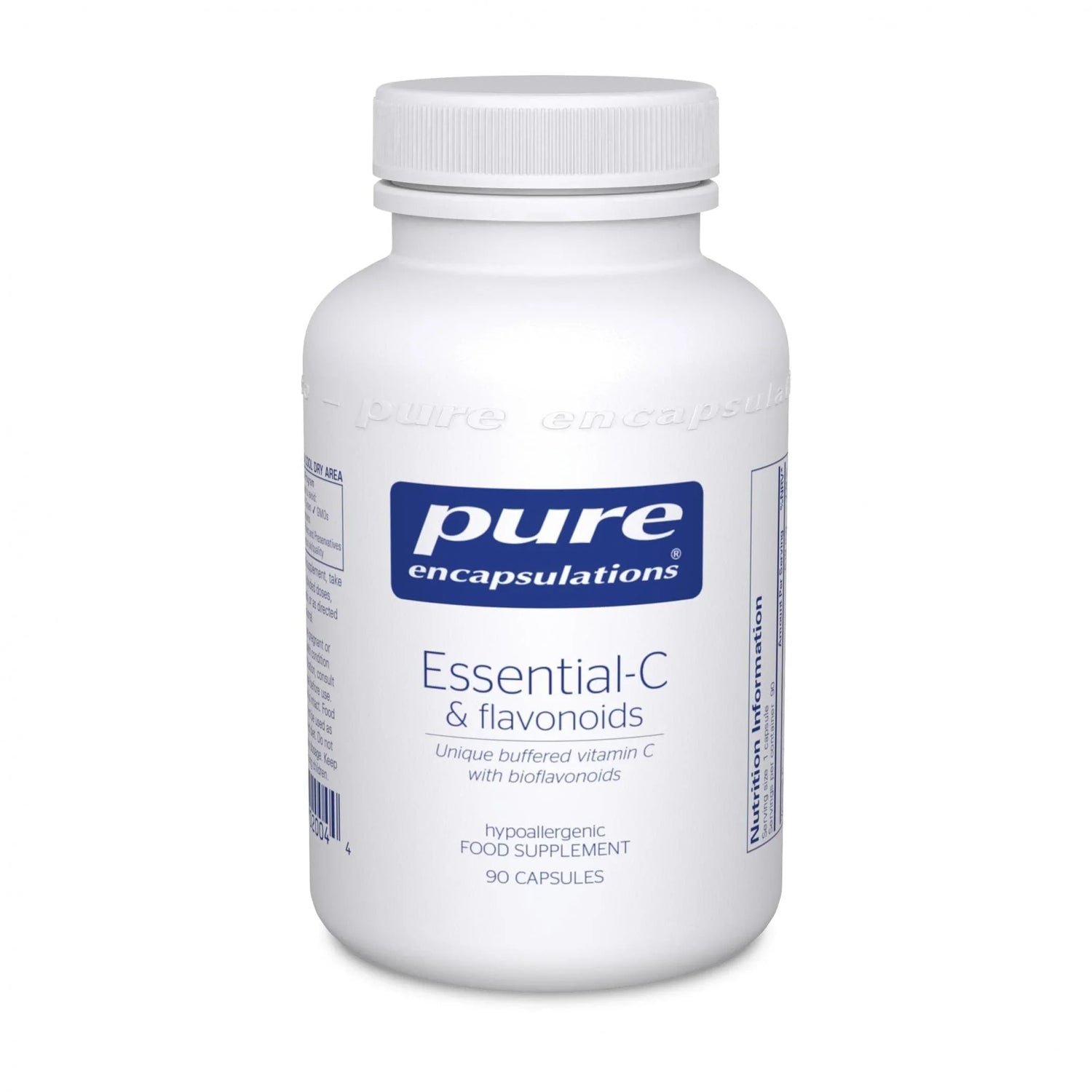 The Essential-C & Flavonoids 90 Capsules by Pure Encapsulations is a dietary supplement that provides enhanced support for the immune system. Each bottle contains 90 vegetable capsules. The main ingredients of the product are Vitamin C, Quercetin, and a proprietary blend of citrus bioflavonoids.