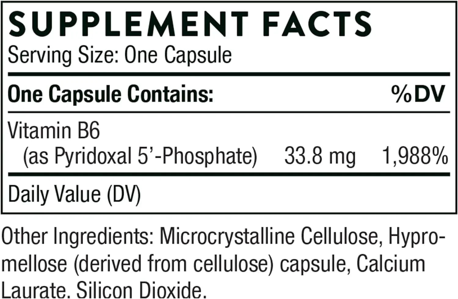 Thorne Research's Pyridoxal 5'-Phosphate (P5P P-5-P), is a dietary supplement comprised of 180 veggie capsules. Each capsule contains Pyridoxal 5'-Phosphate, the active form of Vitamin B6, to support biochemical reactions in the body such as the metabolism of amino acids, lipids, and glucose.