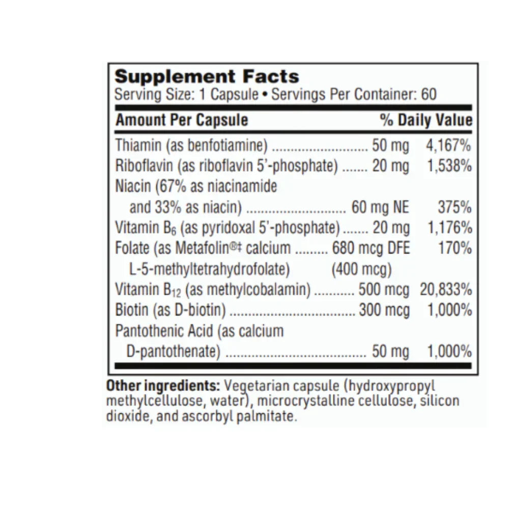 The Active B Complex 60 Capsules from Klaire Labs is a nutritional supplement designed to support a healthy well-being. This product is formulated to aid in functions like energy production, nutrient metabolism, and the maintenance of healthy hair, skin, and nails.