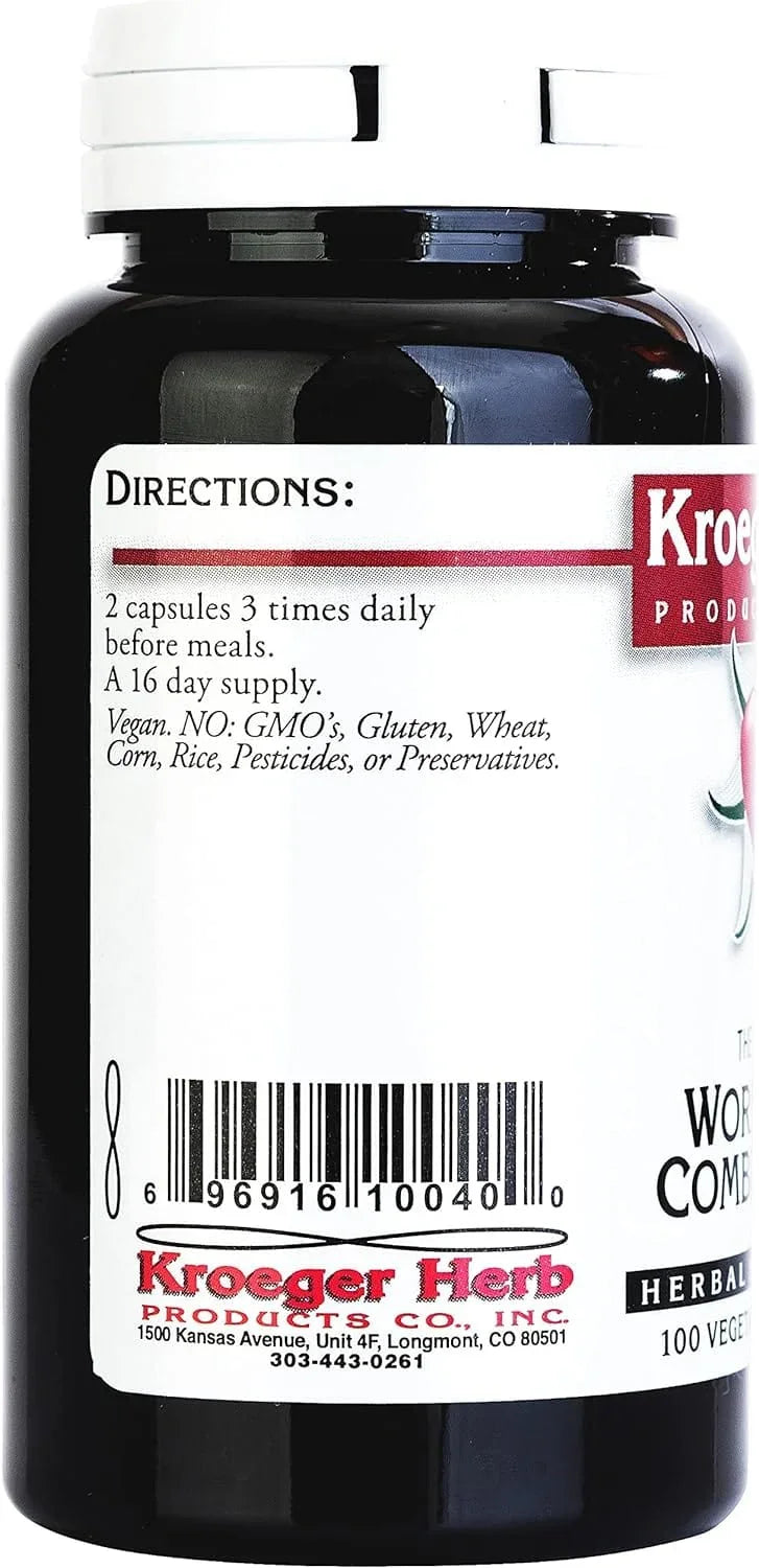 Wormwood Combination is a dietary supplement by Kroeger which comes in a bottle of 100 vegetarian capsules. The primary ingredient in these capsules is wormwood, a herb reputed for its potential health benefits. This formula also contains a blend of other herbs which include clove, pumpkin seed, and black walnut hulls.