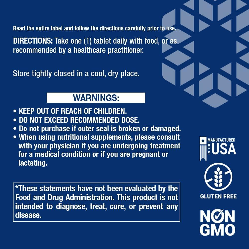 The product is non-GMO certified, and the vegetarian tablets are free from gluten and dairy. These tablets serve as an efficient way to supplement your diet with essential nutrients. It is recommended to take one (1) tablet daily with food or as directed by a healthcare practitioner.