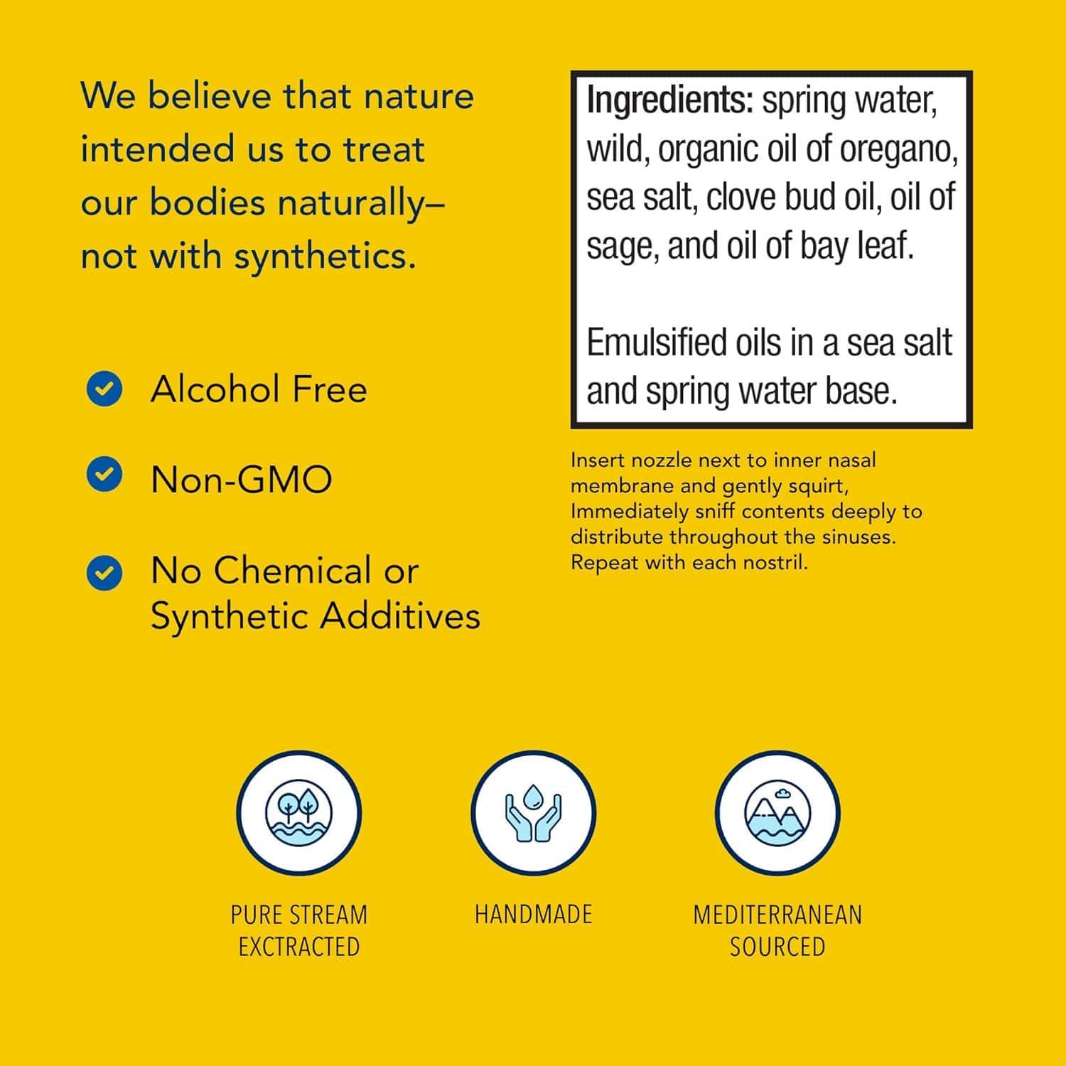 The spray is made from a select blend of wild Mediterranean oregano, bay leaf, sage, and clove in a sea salt base. The blend of these natural ingredients, which are known for their antibacterial and antiviral properties, helps to clean nasal passages and promote sinus health.