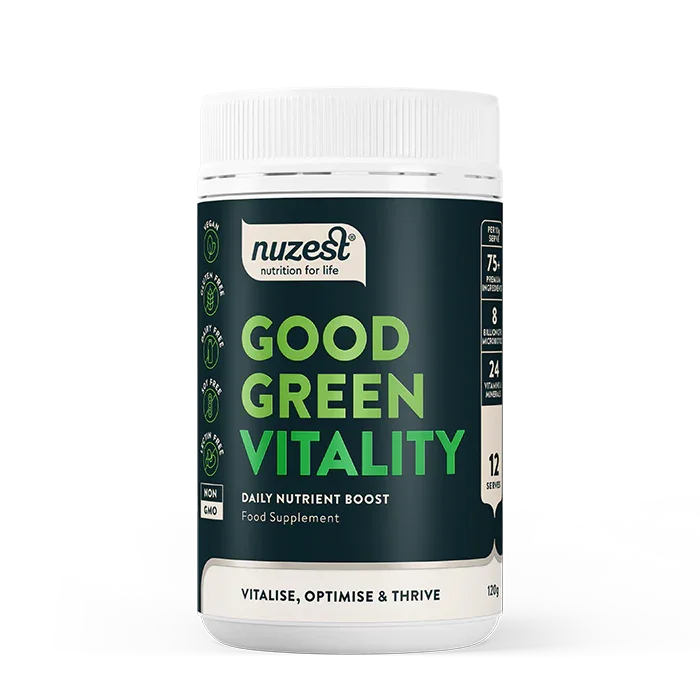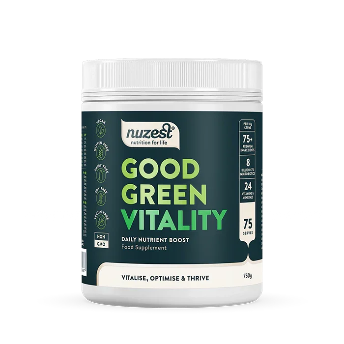 Nuzest Good Green Vitality is a premium nutritional supplement designed to support overall health and wellbeing. This product by Nuzest combines a comprehensive blend of over 75 ingredients, including vitamins, minerals, antioxidants, and plant extracts, with the main active ingredient being spirulina. Good Green Vitality is formulated to provide essential nutrients that may be lacking in your daily diet, helping to maintain energy levels and support immune function.