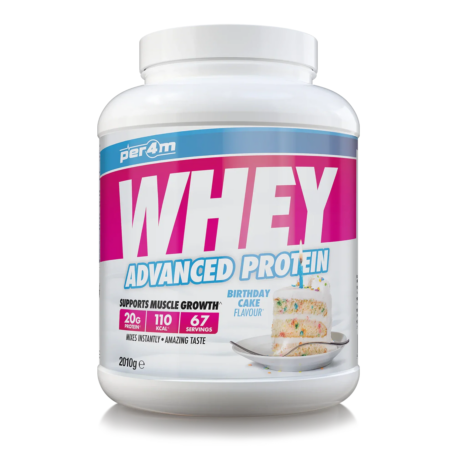 Per4m Advanced Whey Protein Birthday Cake by Per4m is a premium nutritional supplement designed to support muscle recovery and growth. This high-quality whey protein blend features a delicious birthday cake flavour, making it a delightful addition to your daily nutrition routine. The main active ingredient, whey protein concentrate, is renowned for its rich amino acid profile, essential for muscle repair and development.