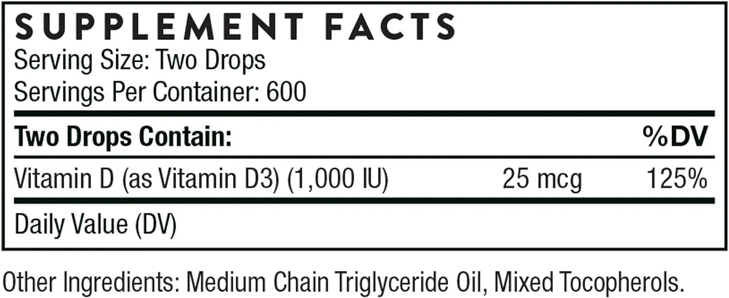 Thorne Vitamin D (D3/D-3) Liquid comes in a 1-ounce (30 ml) bottle, providing approximately 600 servings. This product delivers Vitamin D3, a form of Vitamin D that supports bone, muscle, and immune health. Each serving contains 25 mcg (1,000 IU) of Vitamin D3, equating to 125% of the daily value based on a 2,000 calorie diet. The liquid form facilitates easy administration and can be added to food or beverages.
