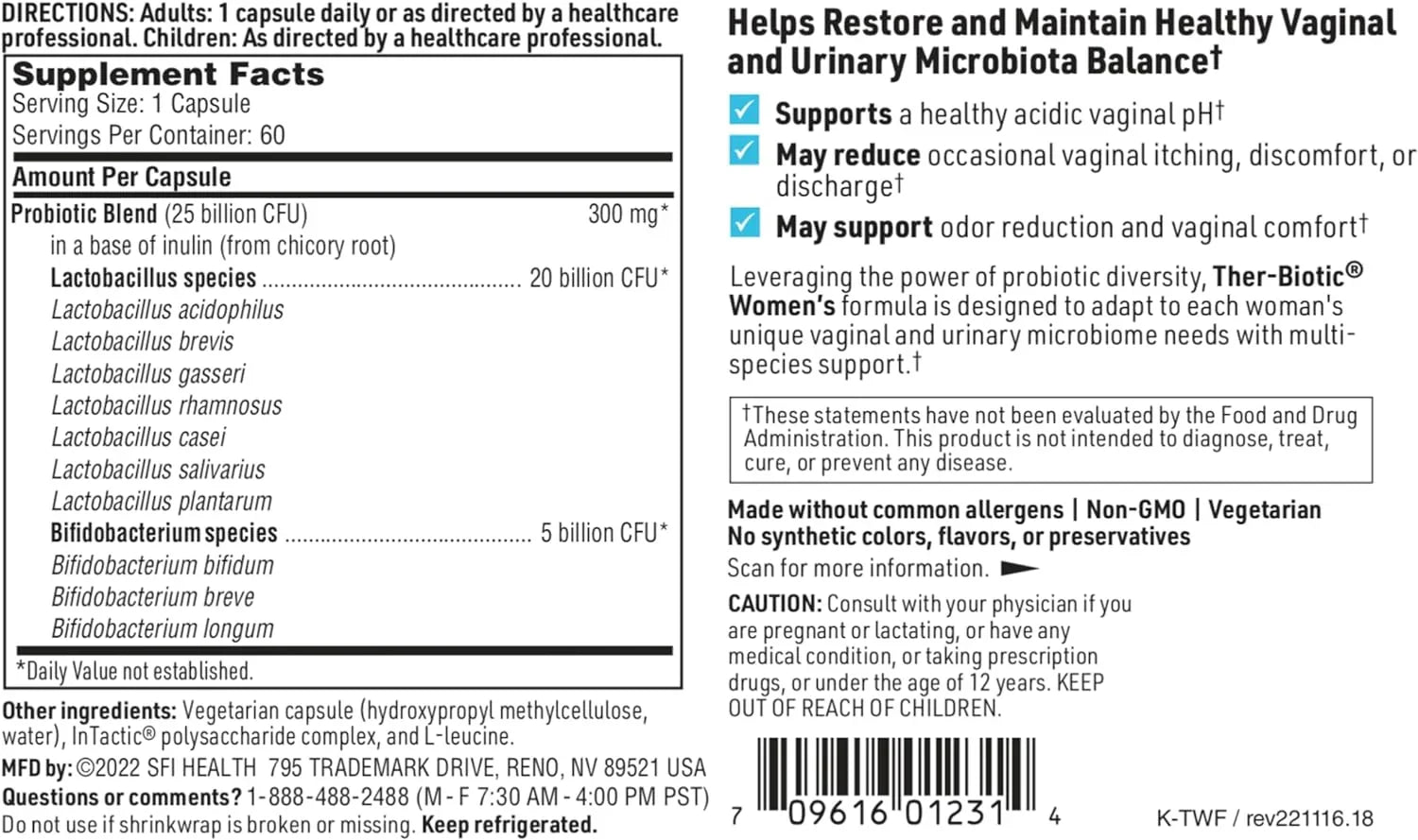 Ther-Biotic Women's Formula is a health supplement product manufactured by Klaire Labs. It comes in the form of 60 capsules packaged in a container. The product is specifically designed to support the urogenital health of women of all ages.