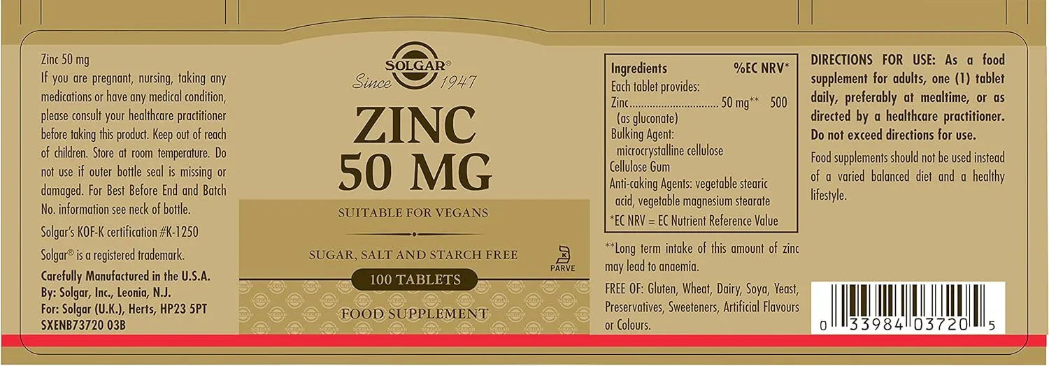 Each tablet contains 50 mg of Zinc in the form of Zinc Gluconate. The formulation is free from gluten, wheat, dairy, soy, yeast, sugar, sodium, artificial flavors, sweeteners, preservatives, and colors. The tablets are suitable for vegetarians and follow a Kosher-certified process.