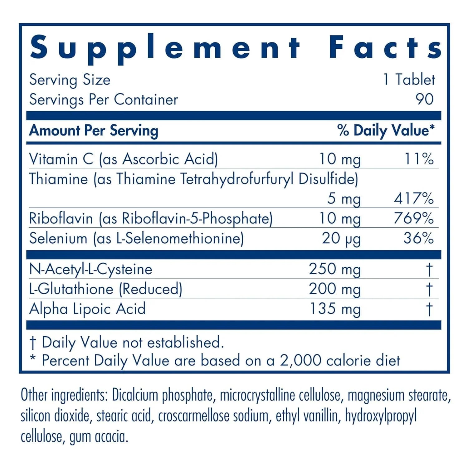 ThioDox Glutathione Complex by Allergy Research Group is a dietary supplement designed to support the body's antioxidant defense system. Each bottle contains 90 tablets formulated to deliver a precise blend of key nutrients.