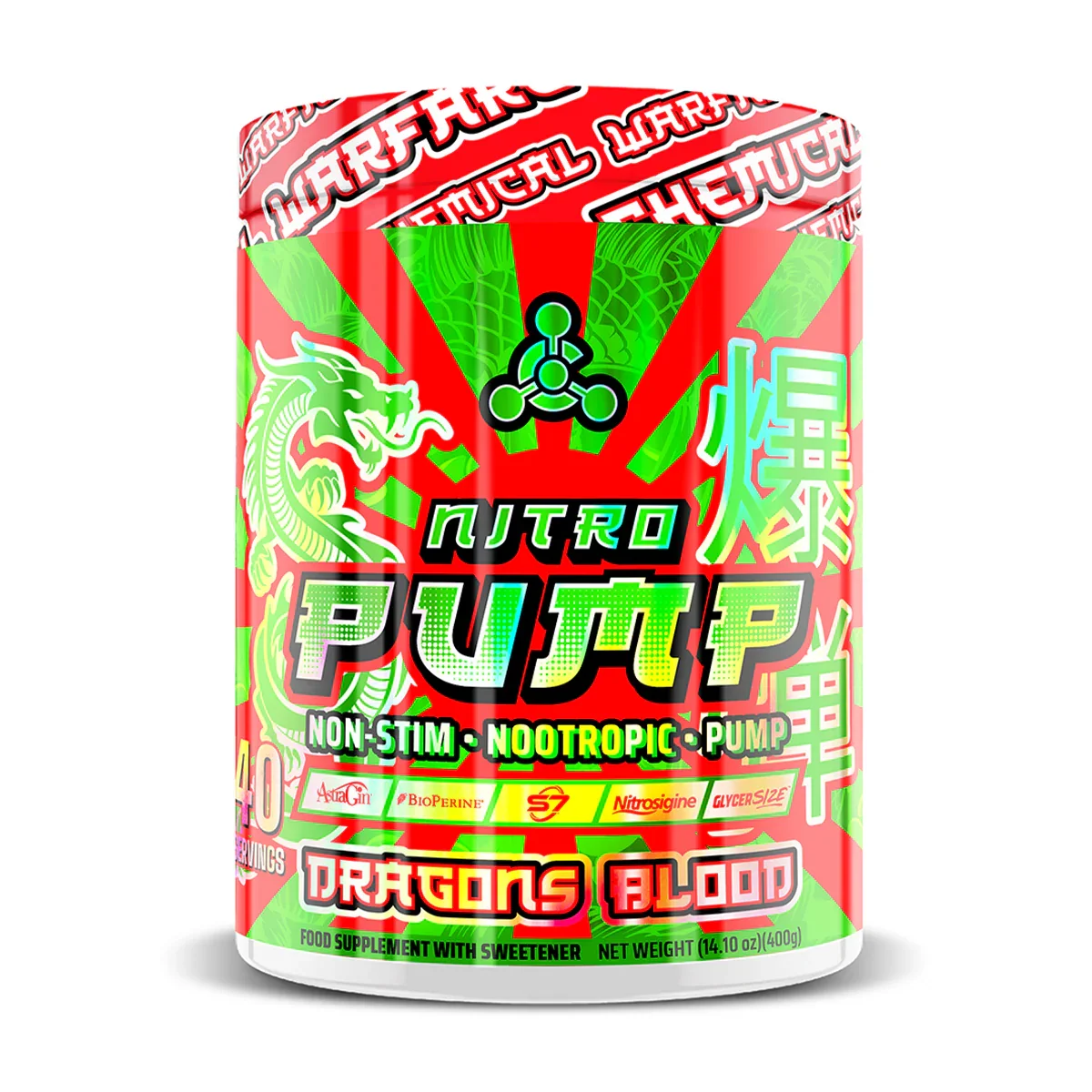 Chemical Warfare Nitro Pump 400g is a premium nutritional supplement designed to enhance workout performance and support muscle growth. This advanced formula by Chemical Warfare features key active ingredients such as L-Citrulline, Beta-Alanine, and Arginine Alpha-Ketoglutarate, which work synergistically to boost nitric oxide levels, improve blood flow, and increase endurance during intense training sessions.