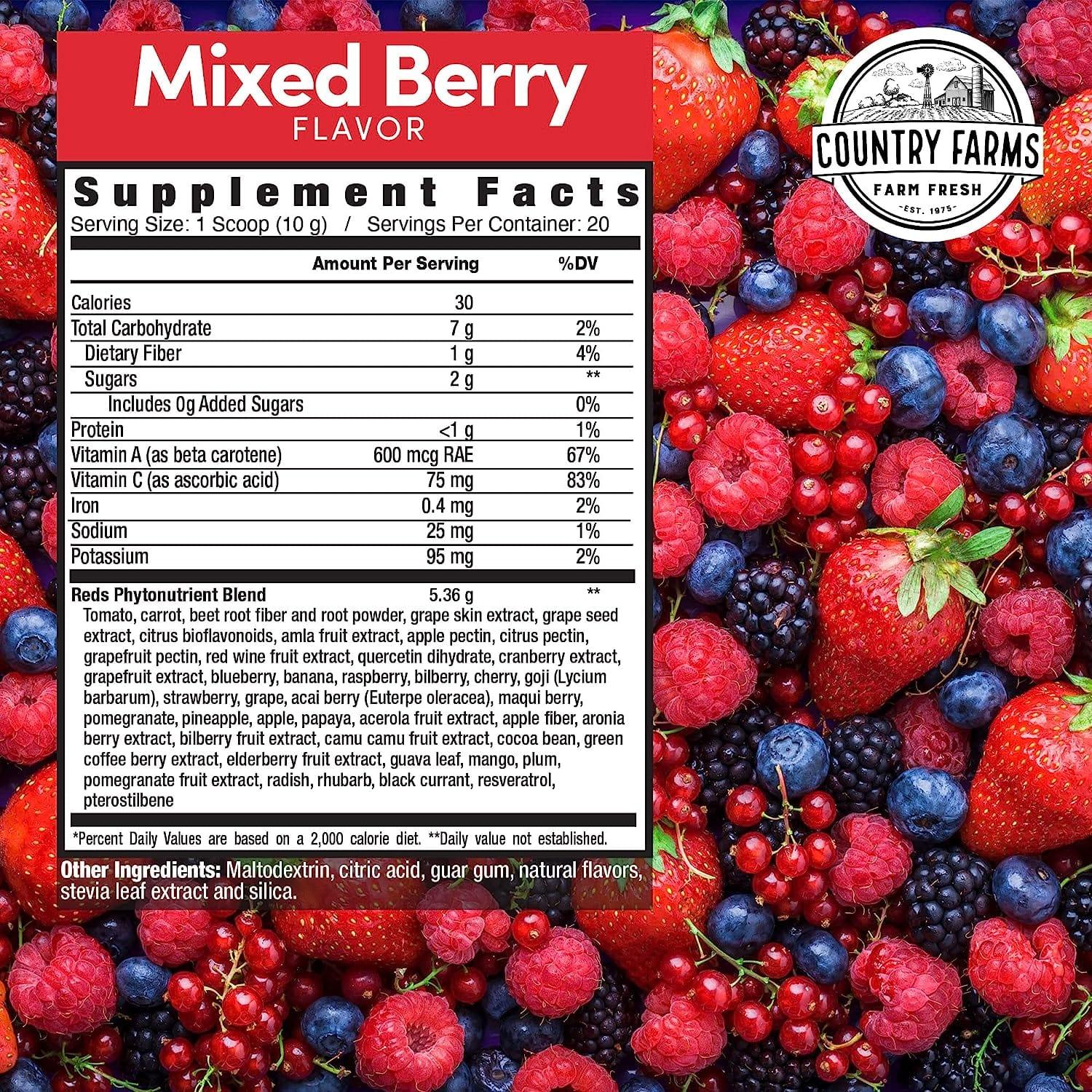 As indicated by its name, the product features a red vegetable and fruit blend. Each serving contains 48 different superfoods and berries like pomegranate, raspberry, and acai, providing the user with an antioxidant boost as well as other potential health benefits.