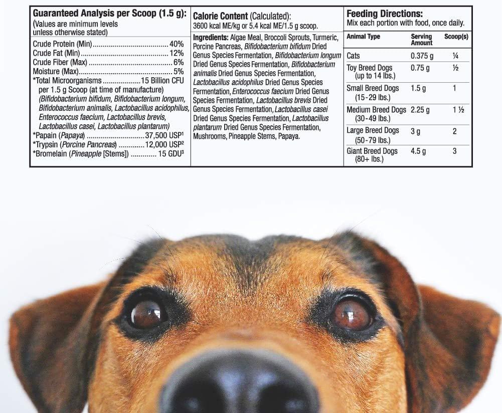 This product also contains high-quality digestive enzymes and fiber from whole foods such as bananas, alfalfa, and chicory root. These ingredients assist in breaking down food and promoting nutrient absorption, thus enhancing the overall health of your pet.