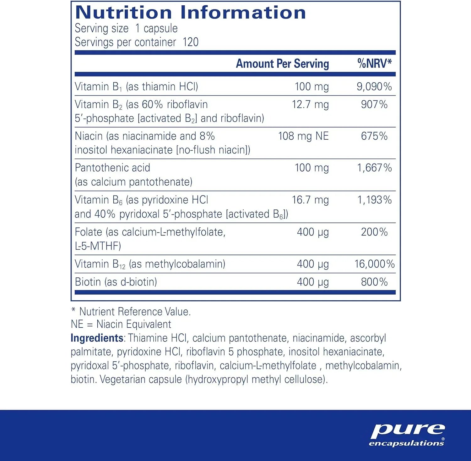 B-Complex Plus with Metafolin 60 veg caps from Pure Encapsulations is a dietary supplement designed to provide all eight essential B vitamins. The formula includes Thiamine (60 mg), Riboflavin (4 mg), Niacinamide (60 mg), Vitamin B6 (10 mg), Folate (as Metafolin L-5-MTHF, 400 mcg), Vitamin B12 (as methylcobalamin, 400 mcg), Biotin (400 mcg), and Pantothenic Acid (100 mg). It also contains choline bitartrate (100 mg) and inositol (100 mg).