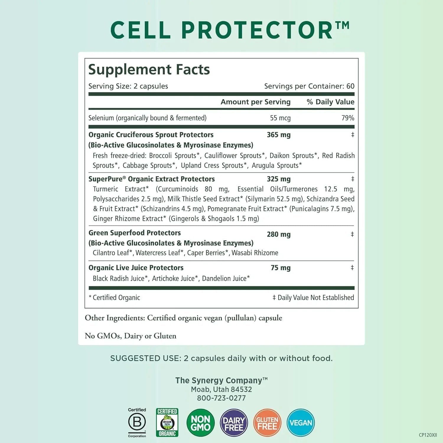 The Synergy Company's Cell Protector is a dietary supplement that comes in a bottle of 120 capsules. This product is specifically designed to support cellular health and longevity. It is made with USDA organic ingredients, encapsulated in vegetable capsules that are suited for vegetarians and vegans.