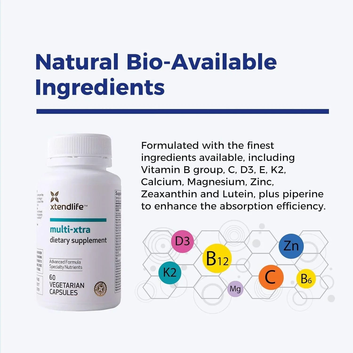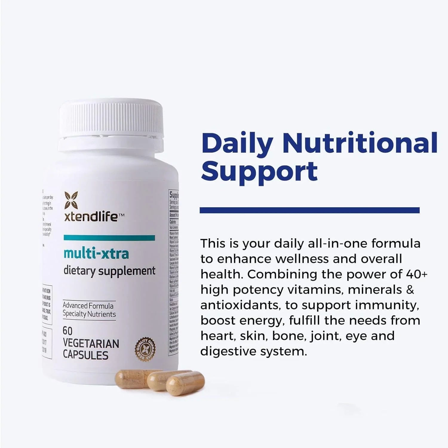 Multi-Xtra - 60 tabs (30 servings) - XtendLife is a dietary supplement that offers a complete range of vitamins and minerals to support daily nutritional needs. Each bottle contains 60 tablets, designed to last for a month with a recommended intake of two tablets per day.